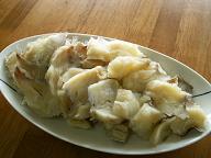 試食会当日。店舗で漬けて頂いていた棒だら(1)を事務所に持ち帰り、毎度のことながら給湯室で調理開始。魚をさばいたことのないうちは、ベテランさんに包丁の持ち方から教えていただきながら(爆)なんとか棒だらをスライスいたしました。(2)炊くときにはもちろん棒だらはぶつ切りなので、スライスできるかどうかも疑問だったんですが、やはり魚は魚、もっと薄いほうがいいかな?とは思いつつもなんとか出来ました。