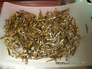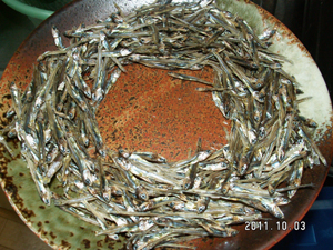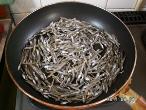 1)ごまめは油気の無いフライパンで、こがさないように、少し冷まして折れるくらいになるまで煎ります。
