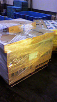 1.ダンボールに入れられ、焼津に搬入されてきたさば。「急速冷凍」の文字がみえます。鮮度を保ったまま加工場へ。 |