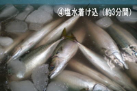 6.氷の塩水にて一定時間漬け込み、身を引き締めて臭みを取り除きます。 |